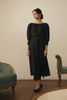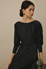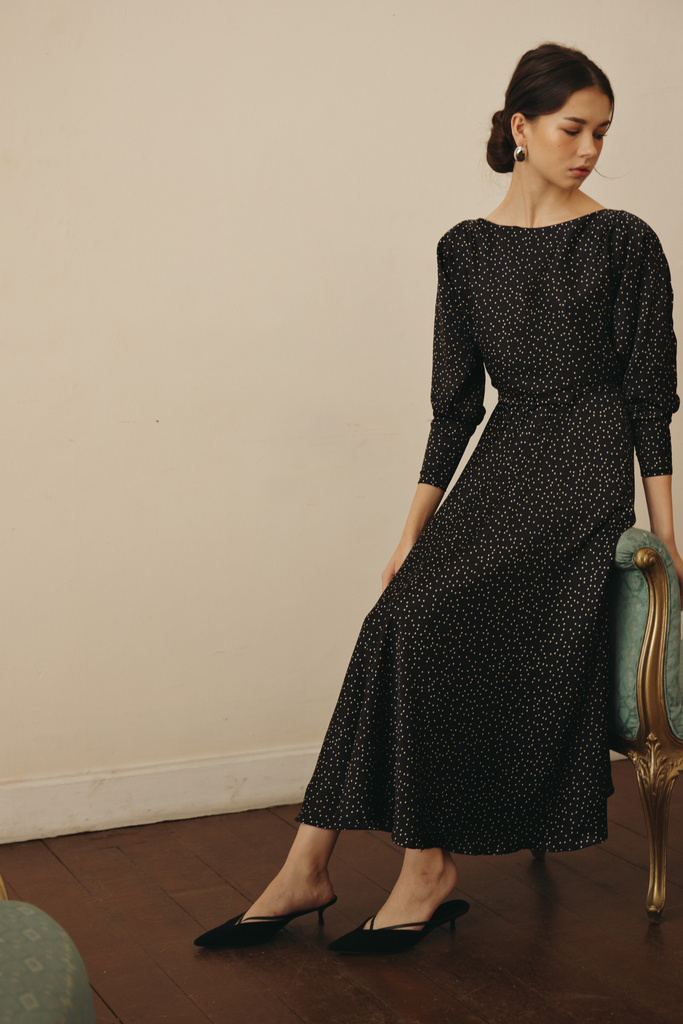 The Helen Dress, in a polka-dot print, features a Sabrina neckline, padded dolman sleeves and and is cinched at the waist by an elegant slim belt. an easy, elegant silhouette. A timeless choice for the holiday season.