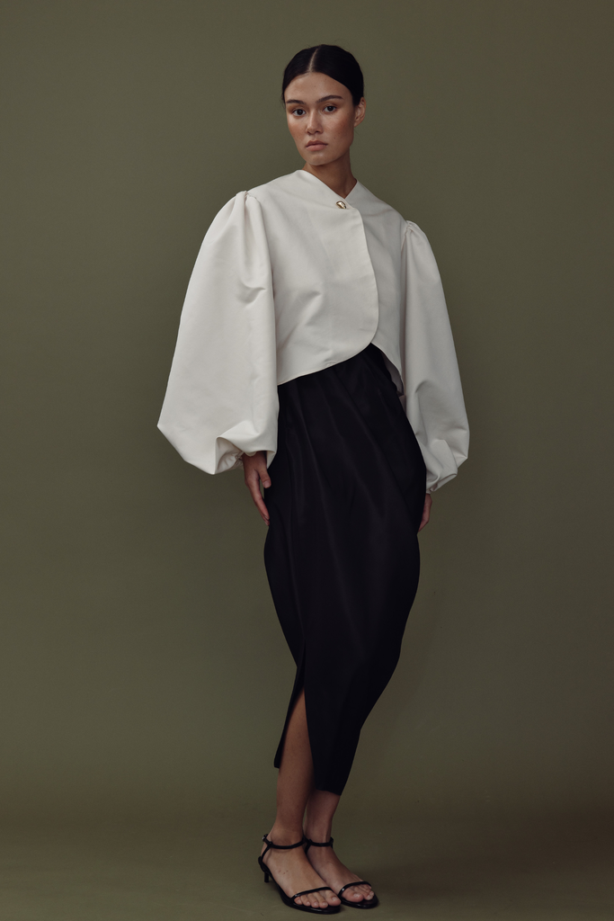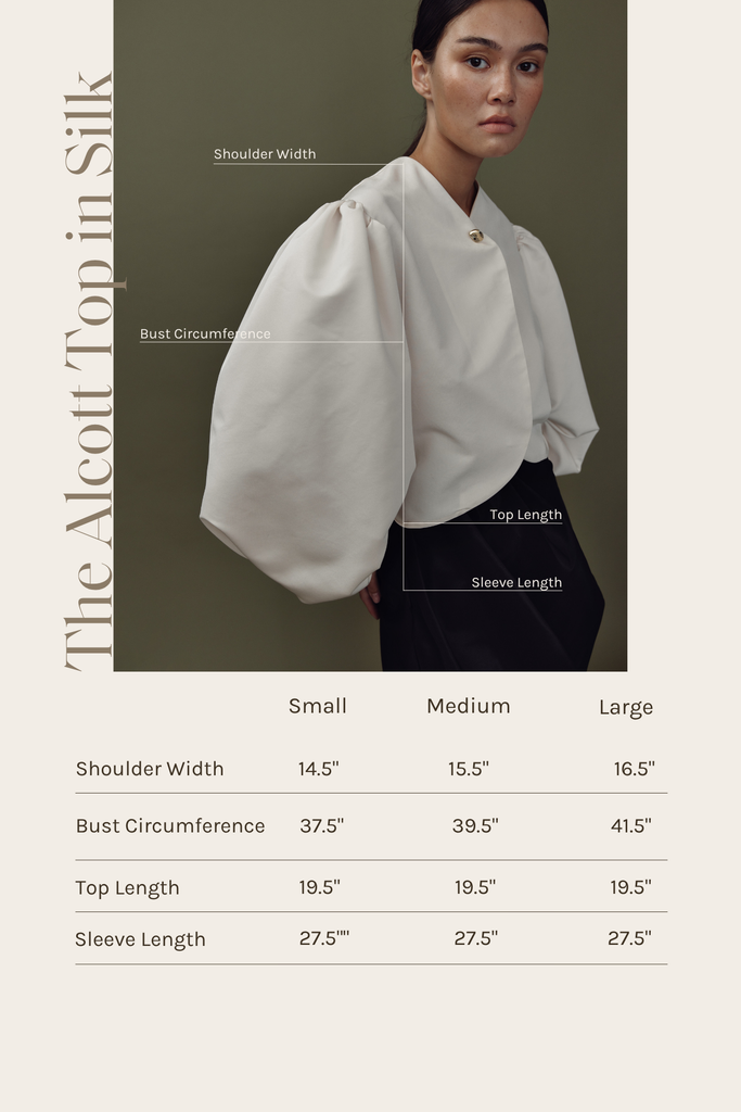 An elevated take on our classic Alcott Shirt, crafted in lightweight Grosgrain silk and defined by bishop sleeves that creates an elegant statement to a wardrobe staple.