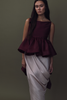 Crafted from silk gazar, the Dara Top features a classic Sabrina neckline with a cascading peplum that adds drama. This statement top is fastened by a dainty bow in the back.