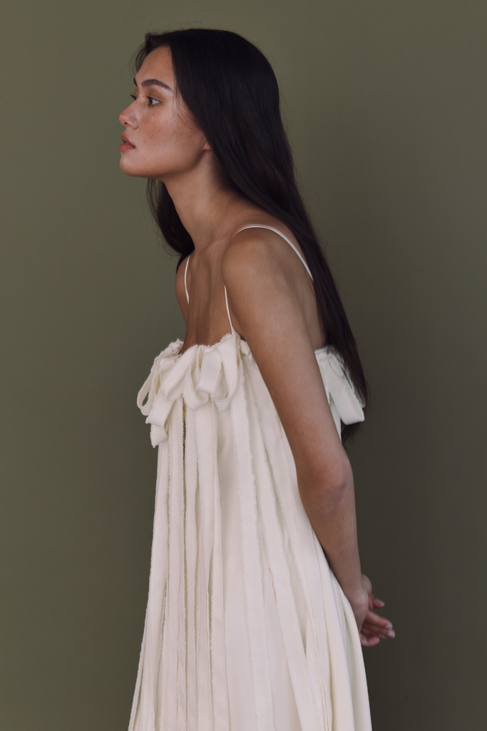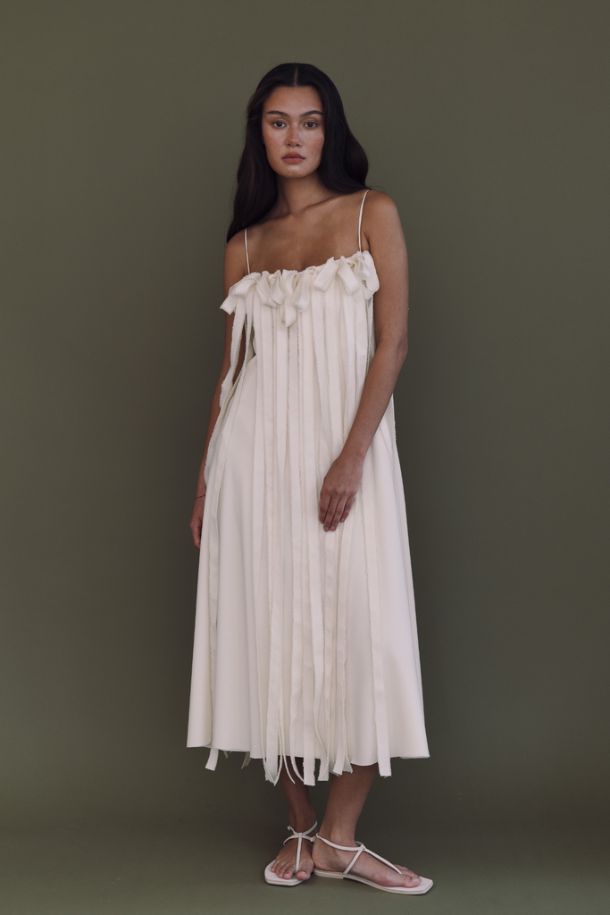 Crafted from fine crepe, the Greta Dress, features gorssgrain ribbons that cascade as soft fringes bringing subtle movement to its timeless shift silhouette.