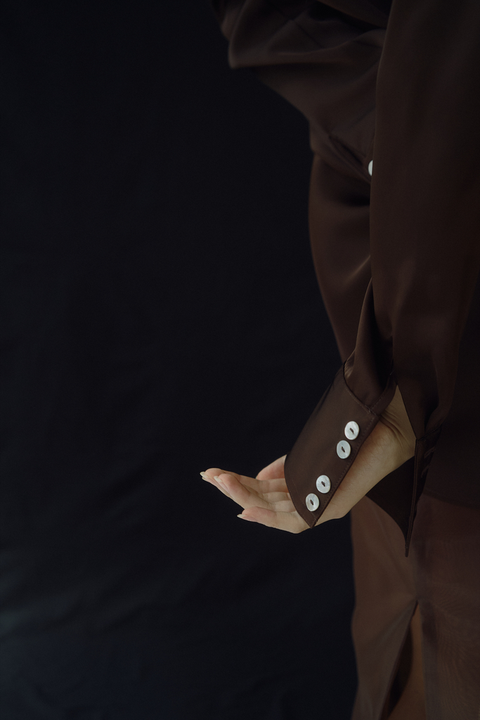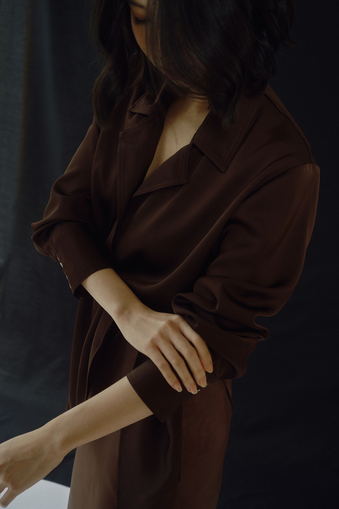 Made from lustrous silk blend fabric and cut for a relaxed fit, this shirt features an elegant notched lapel collar with delicate shell buttons that  are thoughtfully concealed by a hidden placket.