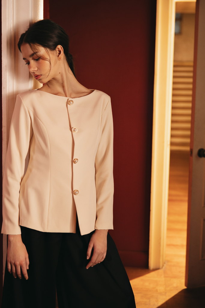 Framed by a Sabrina neckline, this tailored blouse is finished with a gold-plated and pearl closures, making it an understated classic that brings ease and elegance to daily wear.